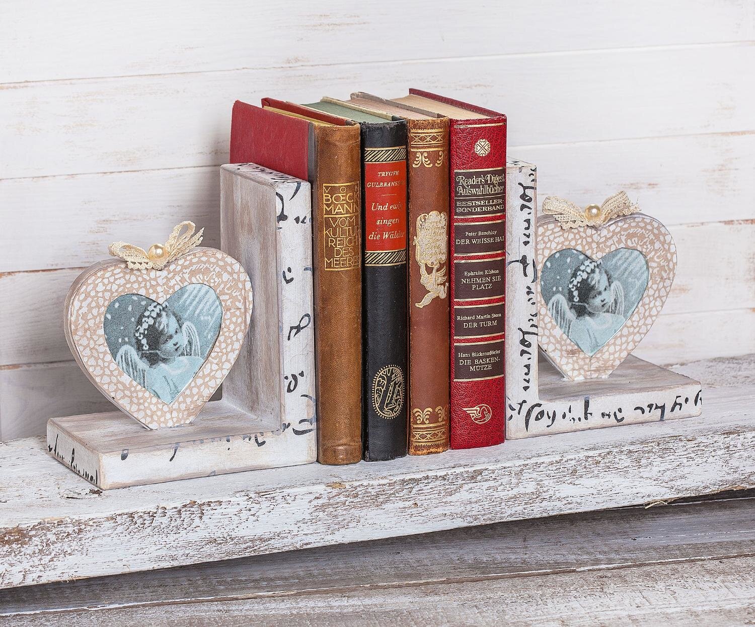 Prendere una spugna per pittura e applicare il fondo bianco ai fermalibri. Per ottenere un aspetto usato, passate leggermente gli altri due colori. Tralasciare i lati anteriori stretti e il cuore. Ritagliare i motivi dal tovagliolo con le forbici da silhouette. Dovrete ritagliare l'immagine nel cuore e il cuore di pizzo. Una volta che tutto è asciutto, è possibile incollare la foto del cuore al centro della cornice con la vernice per tovaglioli. Si consiglia di utilizzare il pennello da tovagliolo. Si riduce il rischio di pieghe e strappi nel motivo. Ora applicate il cuore di pizzo al fermalibri. I caratteri sono attaccati ai lati stretti. Decorare il retro del cuore allo stesso modo della parte anteriore o con i caratteri, anche questo molto carino. Ora fate un fiocco con il pizzo e attaccatelo alla parte superiore del cuore con la colla a caldo. Come tocco finale, inserire una perlina nella colla a caldo quando è ancora liquida.