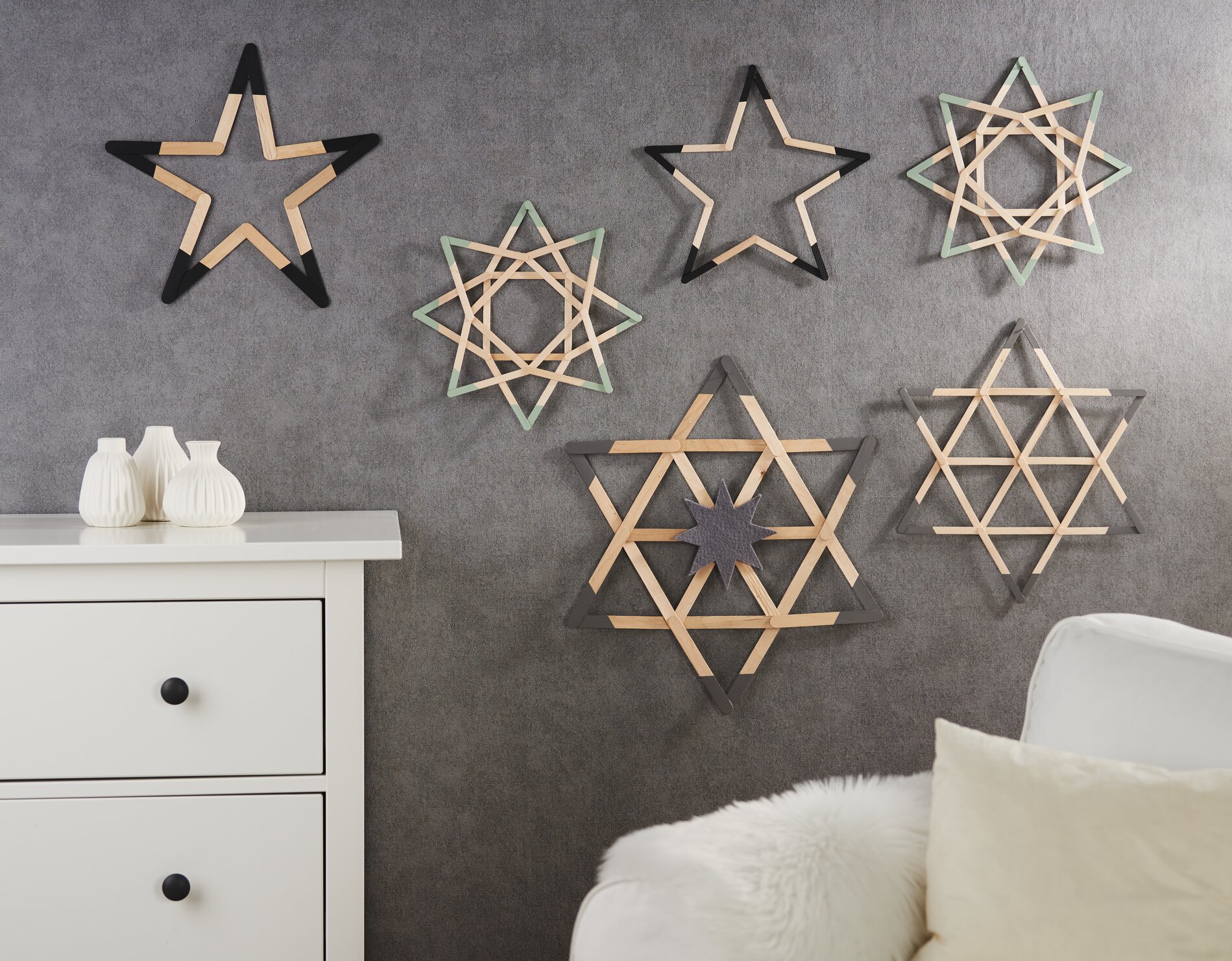 Per prima cosa, incollare i bastoncini di legno VBS desiderati come mostrato nella foto. È importante che le punte delle stelle siano alla stessa distanza nella parte inferiore. Come nel caso della stella semplice con 5 punte, ad esempio.