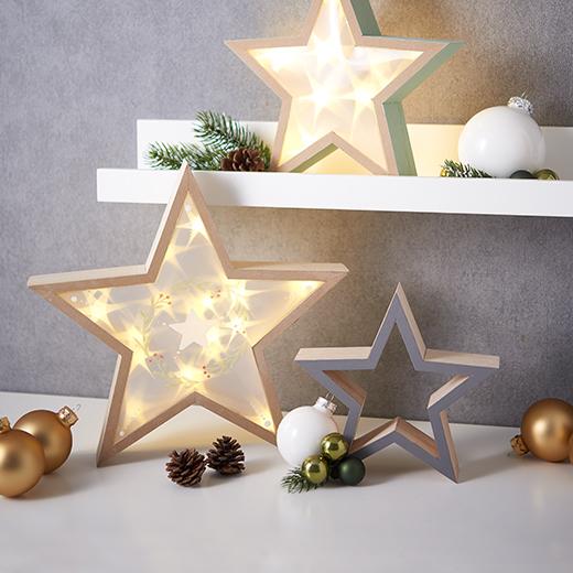 Luci fatate all'interno di ogni stella. Sistemate le stelle in casa con del verde d'abete e delle decorazioni natalizie.