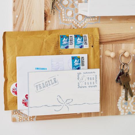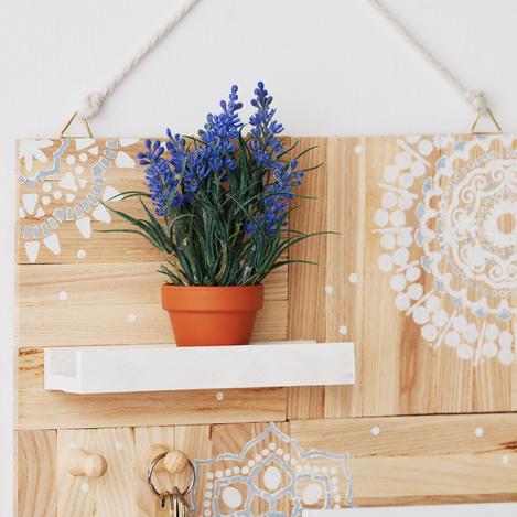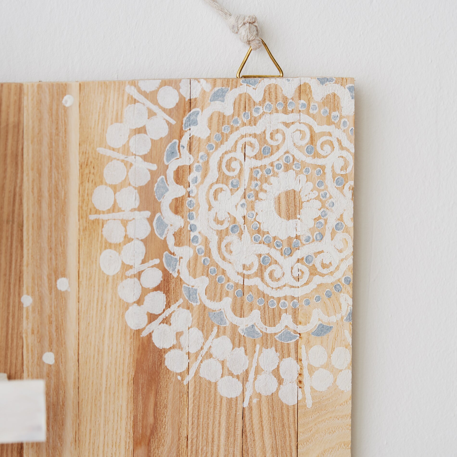 Applicare la colla spray sullo stencil per pittura e posizionarlo sulla tavola. Prelevare un po' di vernice con un pennello asciutto e tamponare con cura il motivo sullo stencil per pittura. Non appena avrete tamponato il colore, rimuovete lo stencil e pulitelo immediatamente con acqua.