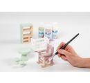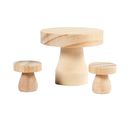 Il tavolo e lo sgabello in miniatura sono realizzati in legno di pino e pioppo. La base in legno è tornita. I due sgabelli hanno un diametro di circa 2,5 cm e un'altezza di circa 2,5 cm. Il tavolo è alto circa 5 cm e ha un Ø di circa 6 cm.