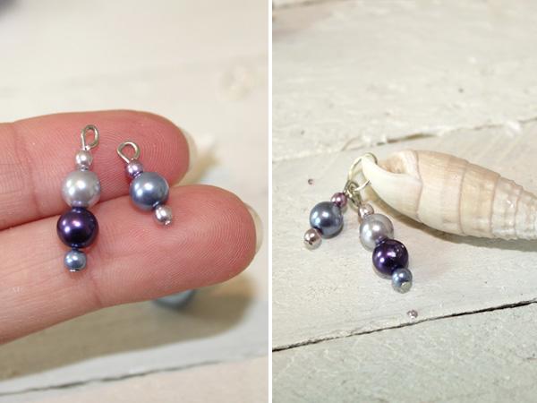 Prendete tre conchiglie grandi e piatte e praticate un foro al centro di ognuna. Infilare le perline desiderate su un perno da prisma e spingerlo attraverso il foro nella conchiglia. Modellare l'estremità sporgente dello spillo in un occhiello usando le pinze. Se è troppo lunga, accorciatela con una tronchesina. Prima di chiudere l'occhiello, fissare un perno a catena su cui infilare anche le perle. Il gancio per orecchio viene fissato all'occhiello finale.