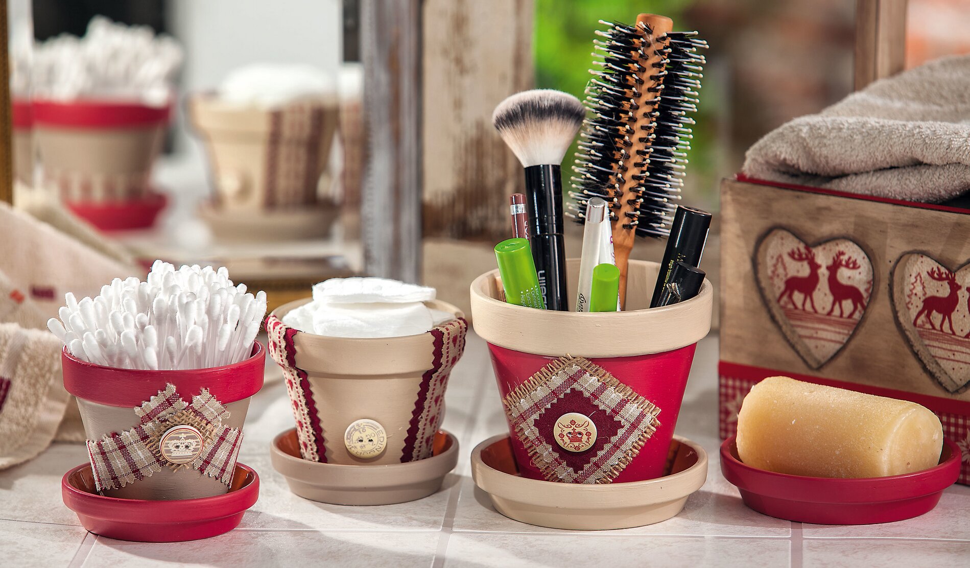 Dipingere i vasi e i piattini con vernice artigianale rosso carminio e una miscela di colori grigio-marrone con un po' di beige. Una volta asciutti, con le forbici da mignolo tagliate quadrati e strisce di qualsiasi dimensione dai tessuti e dalla tela di iuta e incollateli ai vasi con la colla artigianale. Le forbici non solo creano un bordo decorativo, ma evitano anche che il tessuto si sfilacci rapidamente ai bordi. Infine, incollate alcuni bottoni sui vasi.