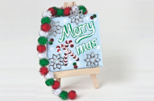 Dipingere il telaio della barella con la vernice acrilica usando un pennello fine. Le paillettes rosse e bianche possono essere posizionate a formare i bastoncini di zucchero e fissate con spilli o colla artigianale. I bastoncini di zucchero formano anche la X di Merry X-Mas.