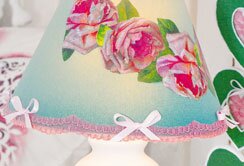 Ritagliare dei ghirigori dal pizzo . Attaccate il nastro intorno al bordo inferiore del paralume e fissate il pizzo. Attaccate le volute di pizzo e un nastro di raso al bordo superiore della lampada usando lo stesso nastro. Create dei piccoli fiocchi con il nastro di raso e usateli per decorare la lampada.