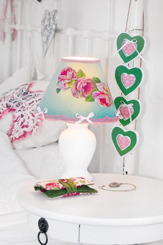 Questa bellissima e romantica lampada è rivestita di tessuto e pizzo. Il colore verde intenso forma un efficace contrasto con il motivo a rose della seta di paglia. Decorate questa lampada da tavolo con piccoli dettagli e rendetela la vostra preferita.