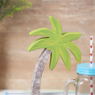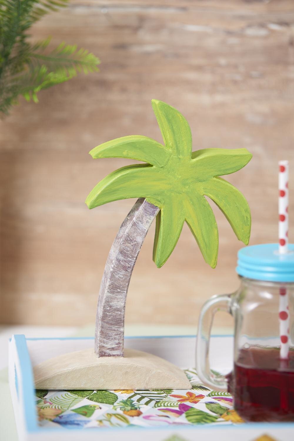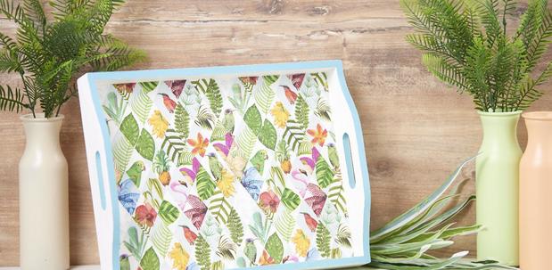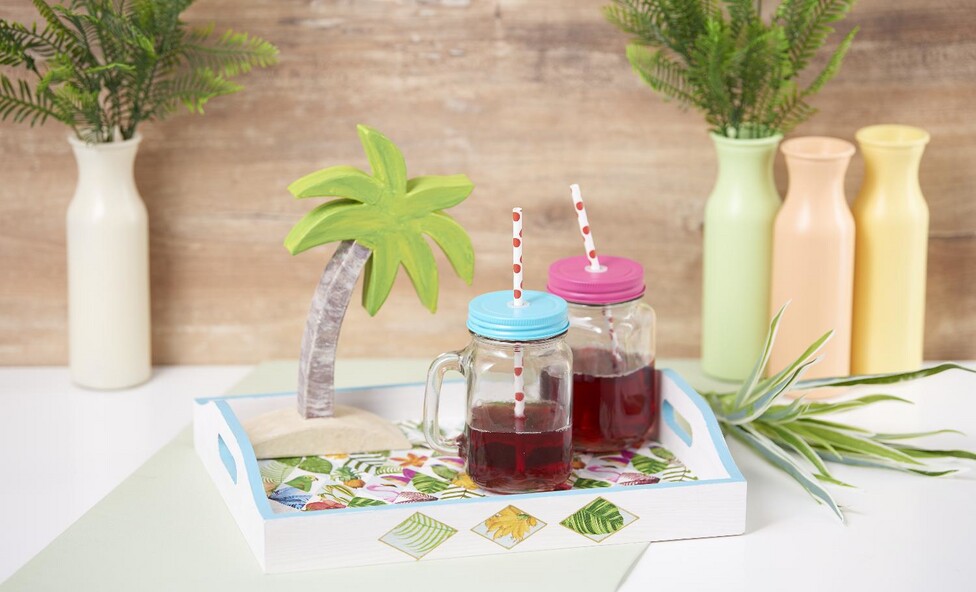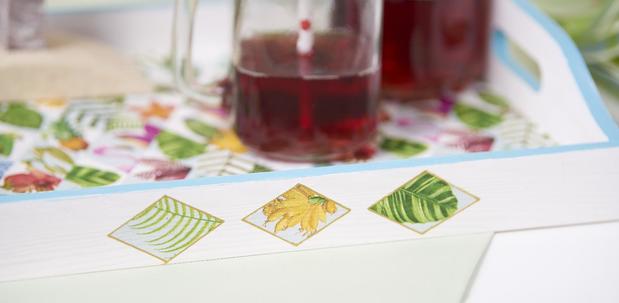 Per il motivo tropicale, utilizzare un tovagliolo e incollarlo al vassoio con la vernice per tovaglioli . A tal fine, rivestire il vassoio con la vernice per tovaglioli e posizionare lo strato superiore stampato del tovagliolo al centro del vassoio. Quindi, rivestire nuovamente il vassoio con la vernice per tovaglioli. Stendere la vernice in modo uniforme sul vassoio, in quanto si asciuga in modo da ottenere una finitura opaca e setosa e quindi una superficie complessivamente lucida.