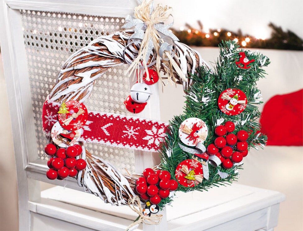 Bottoni, campanelle e rami di abete sono messi in scena ad arte, mentre la ghirlanda di salice riceve il suo fascino invernale dalla neve decorativa. Combinate efficacemente i pezzi sparsi e i nastri in questa ghirlanda e appendetela alla vostra porta per attirare l'attenzione nel periodo natalizio.