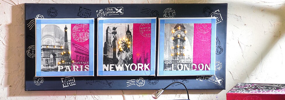 Il cosiddetto stile factory si distingue soprattutto per le sue forme estremamente chiare e i sobri colori di base. Questo telaio a barella di tendenza porta le grandi metropoli direttamente a casa vostra. I motivi dei tovaglioli si adattano perfettamente ai piccoli telai a barella e sono resi più belli dalla catena di luci a micro LED.