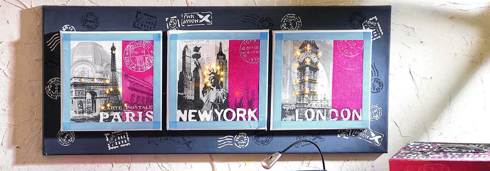 Mescolare un colore antracite con una vernice acrilica bianca e nera e applicare la vernice sul telaio della barella. Lasciare asciugare. Spruzzare lo stencil con l'adesivo spray "Non-Permanent 404", posizionarlo sul telaio e dipingerlo saldamente. Applicare i motivi a stencil con vernice acrilica bianca e nera, rimuovere immediatamente lo stencil e lavarlo, quindi riapplicarlo. Incollare i vari motivi dei tovaglioli sui telaietti. Suggerimento: spruzzare prima i tovaglioli con l'adesivo spray "Non-Permanent 404", in modo da poterli posizionare senza pieghe e rimuoverli nuovamente se necessario. Una volta posizionati correttamente i tovaglioli, sigillarli con la vernice per tovaglioli. Una volta asciutto, incollate il nastro adesivo intorno alle cornici piccole. Praticare un foro nel telaio grande per infilare le micro luci LED e far passare l'intero filo di rame fino alla parte anteriore. Inserite le luci nei motivi dei telai piccoli da dietro, utilizzando le forbici per fare dei piccoli fori nei punti più importanti e fissate le luci con la colla a caldo. Importante: iniziare con l'ultima luce sul filo per avere maggiore libertà di movimento. Infine, fissate i telai piccoli al telaio grande con la colla a caldo.