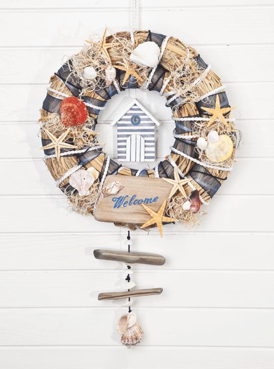 Nel nostro esempio di ghirlanda, abbiamo trasformato una semplice ghirlanda di fieno in una bellissima ghirlanda marittima. Per farlo, abbiamo avvolto un nastro di organza blu scuro intorno alla ghirlanda e lo abbiamo fissato con un cordoncino chiaro e un po' di colla a caldo. Le decorazioni nautiche andavano da conchiglie e stelle marine a un simpatico cavalletto.
