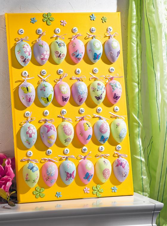 Applicare una mano di fondo sul telaio da stiro 40 x 60 cm in giallo ranuncolo e lasciare asciugare. Posizionare le metà dell'uovo sul telaio e segnare i punti appropriati con un punto. Con un bisturi, praticare una fessura nel punto segnato e un'altra 5 mm sopra. Far passare il nastro di raso attraverso le fessure e fissare le uova acriliche dipinte e incollate al telaio.