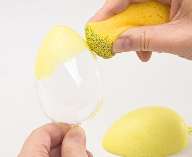 Mescolare tutti i colori artigianali (verde maggio, blu turchese, rosa) con l'avorio per creare una tonalità pastello, tamponare i colori sulle metà dell'uovo acrilico con una spugna da pittura e lasciare asciugare. Applicare due mani di vernice in modo da coprire completamente i colori.