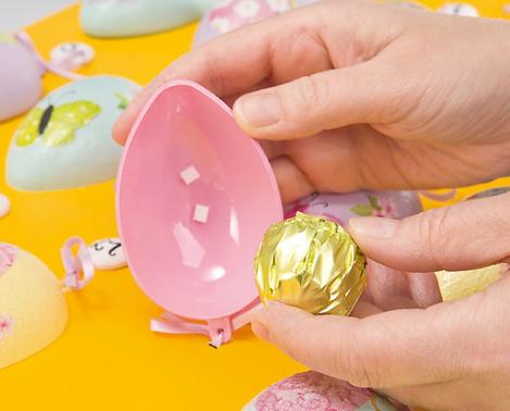 A questo punto si possono fissare dei piccoli dolcetti nelle uova con delle pastiglie adesive per fare una dolce sorpresa pasquale.