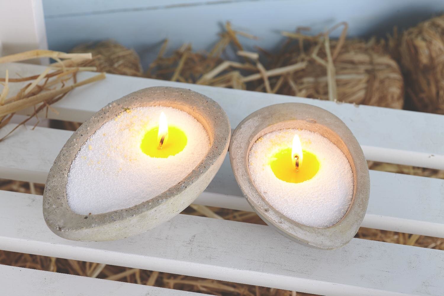 È sufficiente inserire uno stoppino di candela nei contenitori delle uova finite e riempire con sabbia di candela gialla, quindi cospargere un secondo strato di sabbia di candela bianca.