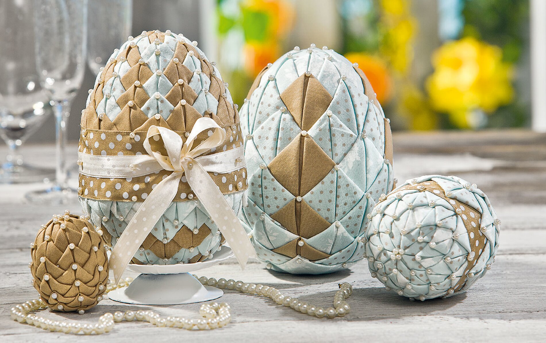Per le uova di carciofo occorrono 30 cm di tessuto di cotone a tinta unita di colore marrone chiaro, 30 cm di tessuto a contrasto in tinta con un motivo, spilli, uova di polistirolo delle dimensioni di 6 cm, 10 cm e 16 cm, spilli con testa decorativa, nastro coordinato e, se disponibile, un candeliere con punta.
