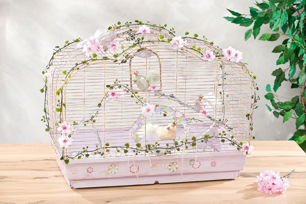 Decorate gli uccellini, i fiori e le ghirlande di foglie sopra e dentro la gabbia per uccelli secondo il vostro gusto personale. A questo scopo si può utilizzare anche la vecchia altalena per uccelli (pulita).