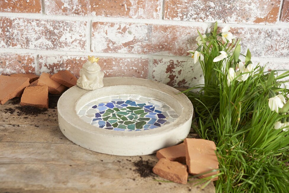 Per poter riempire d'acqua anche la vasca per uccelli, è necessario rivestire la superficie del mosaico o la superficie interna dell'abbeveratoio con