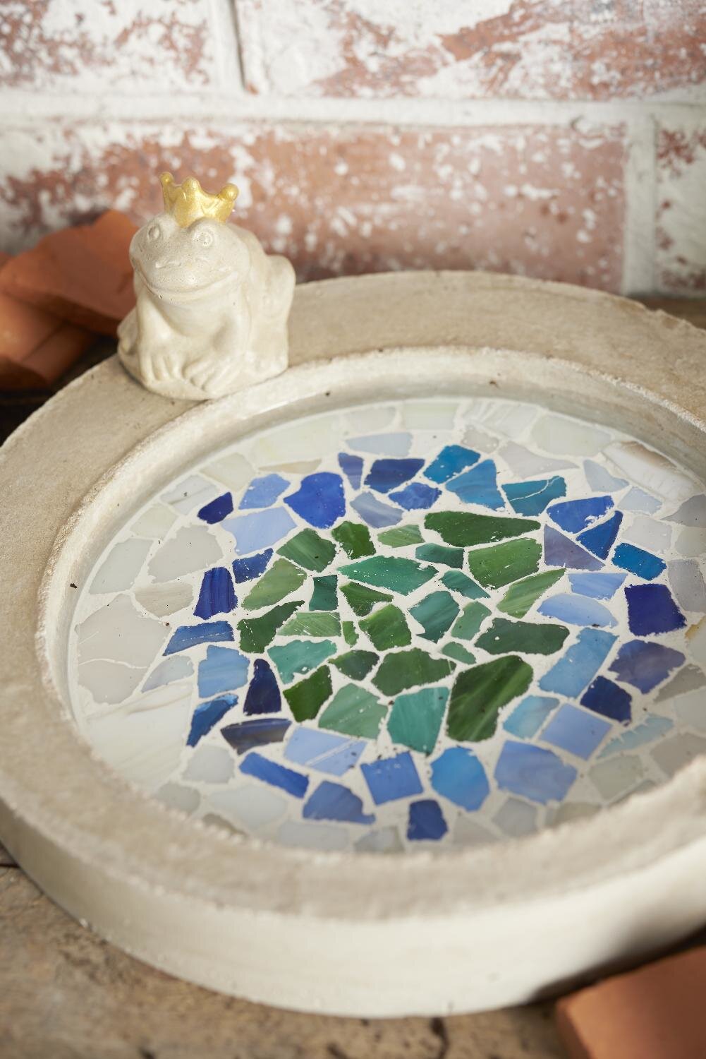 tessere di mosaico a seconda del gusto personale: ogni tessera viene posizionata singolarmente e le tessere vengono fissate alla base della vasca per uccelli con la colla per mosaico.