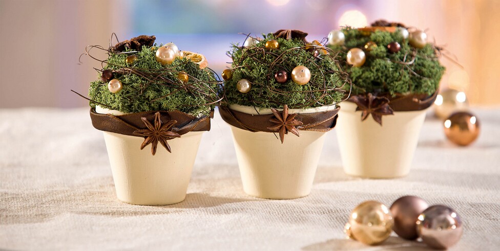 Impregnate i vasi di terracotta di bianco antico e poi infilate le palline di polistirolo all'interno. A questo punto, fissate il muschio islandese con gli spilli per fiori di paglia. Avvolgete un po' di salice decorativo e fissate anche questo. Decorate ora le palline di muschio con perline, stelle di anice e piccoli pezzi di arancia.