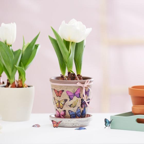 A questo punto, utilizzare la colla VBS per attaccare le farfalle al vaso di terracotta.