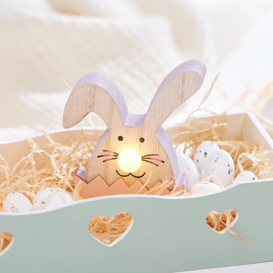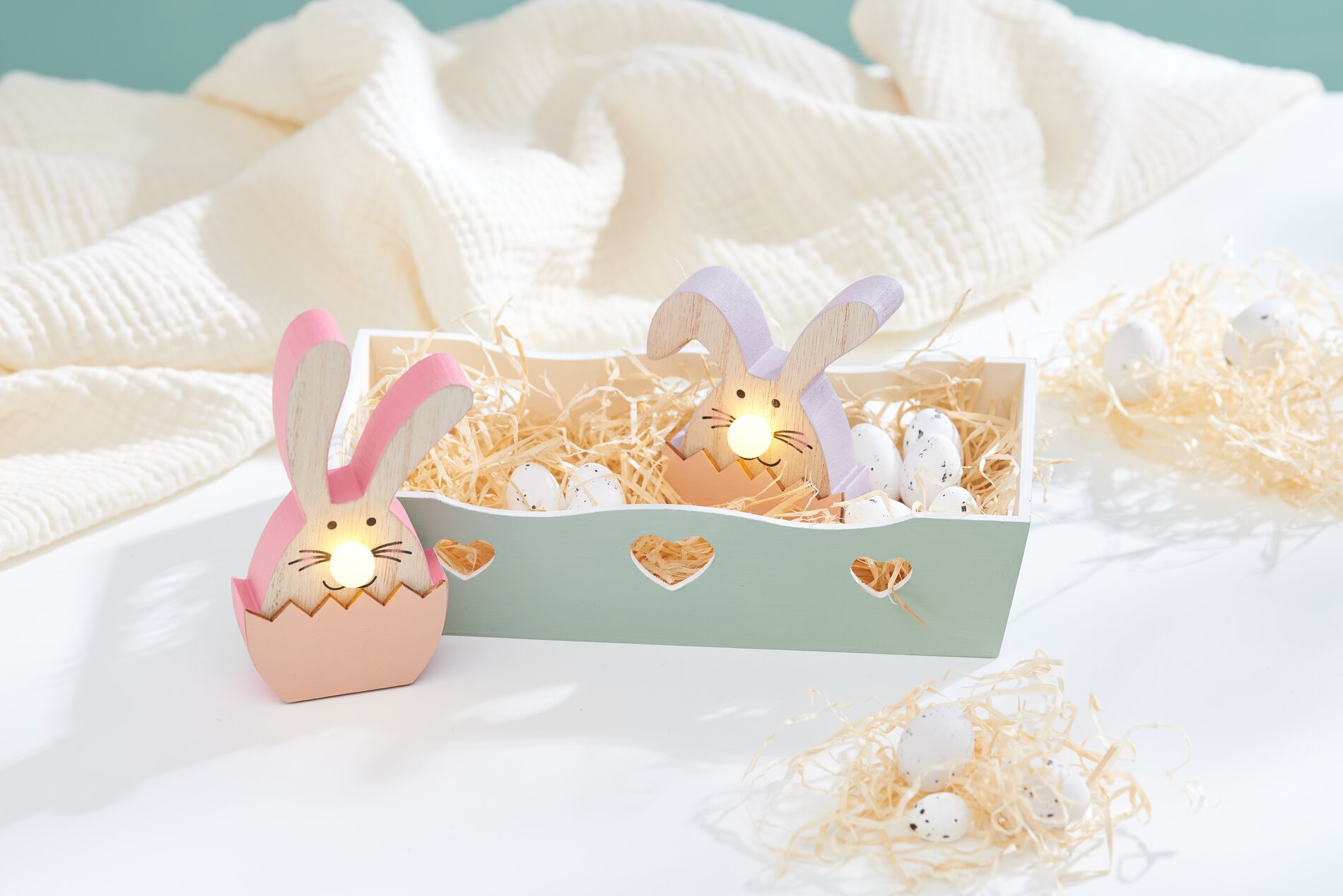 Una volta che la vernice è completamente asciutta, riempite la ciotola con lana di legno. Questo materiale naturale crea un aspetto di nido accogliente e costituisce la base perfetta per posizionare le figurine dei coniglietti in modo accattivante. Sistemate i coniglietti come desiderate in modo che prendano posto nel "nido".