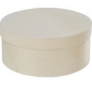 La scatola rotonda in legno truciolato ha un diametro di circa 12 cm ed è alta circa 5 cm.