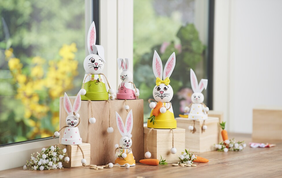 4 nastri di juta lunghi circa 10-15 cm per ogni coniglietto. Fate un nodo alla base di ogni nastro e infilateci una pallina di legno. Quindi fissare le braccia, le gambe e la testa al vaso di argilla con un po' di colla a caldo.