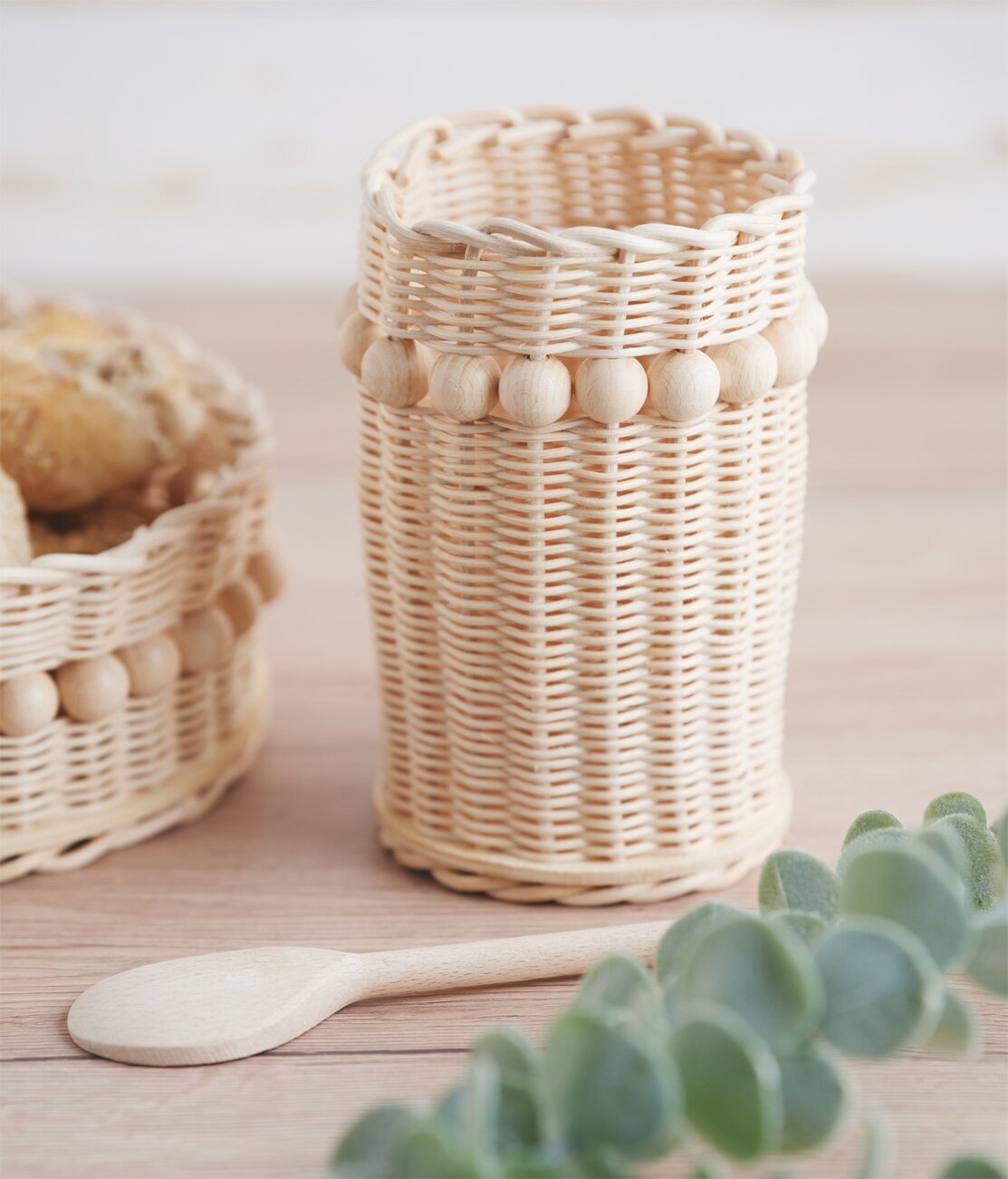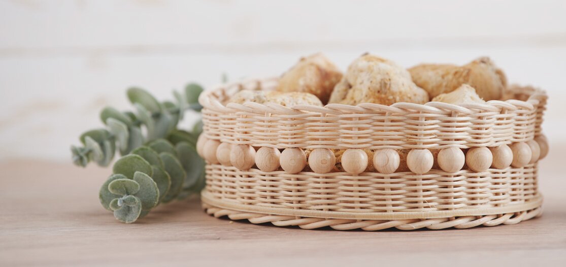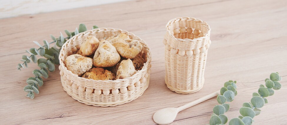 Per realizzare il cestino, occorrono innanzitutto 33 pezzi di canna spessa 3 mm, lunghi 25 cm ciascuno (in futuro si chiameranno pali). Immergere i pali in acqua tiepida per 5 minuti. Inserite 1 paletto di 5 cm alla volta attraverso i fori previamente praticati nella base della canna, fino a riempire tutti i fori con i paletti.