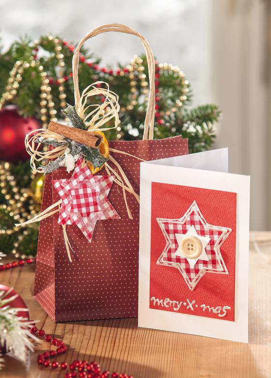 Incollare un pezzo di cartoncino rosso come passe-partout con la stella di tessuto in cima.